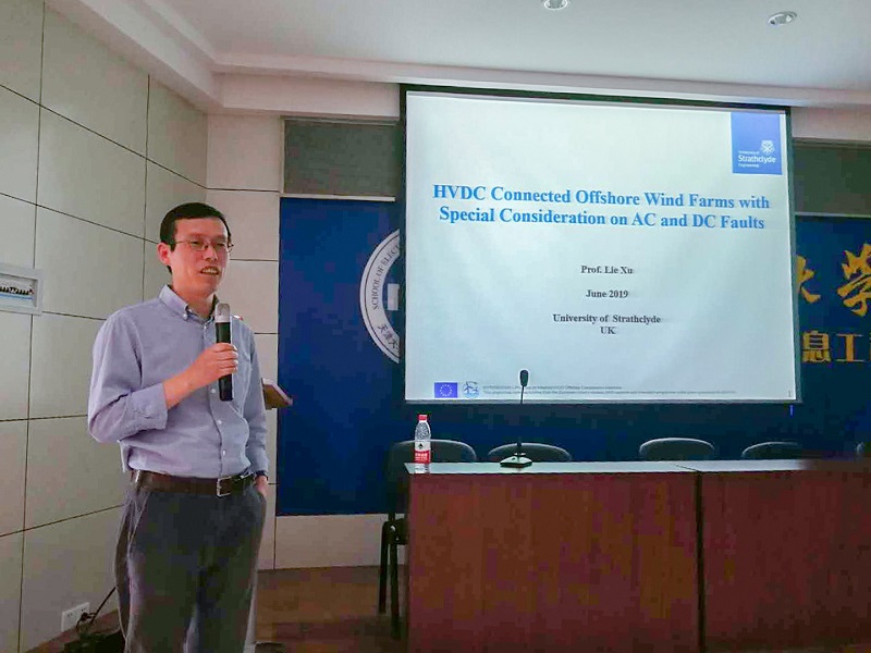 徐烈教授首先介绍了英国以及欧洲海上风电的发展现状,之后分析了岸上电网、直流电网以及离岸弱网故障时各自特性,接着分别介绍了针对离岸弱网的现有MMC并网方案与新型DRU并网方案,并从工程造价、运营维护成本、故障特性等方面对比分析DRU方案所具有的优势。最后,徐烈教授分享了自身的科研经历,并向同学们送出寄语。讲座结束后,徐烈教授与在座师生进行了深入的交流讨论。