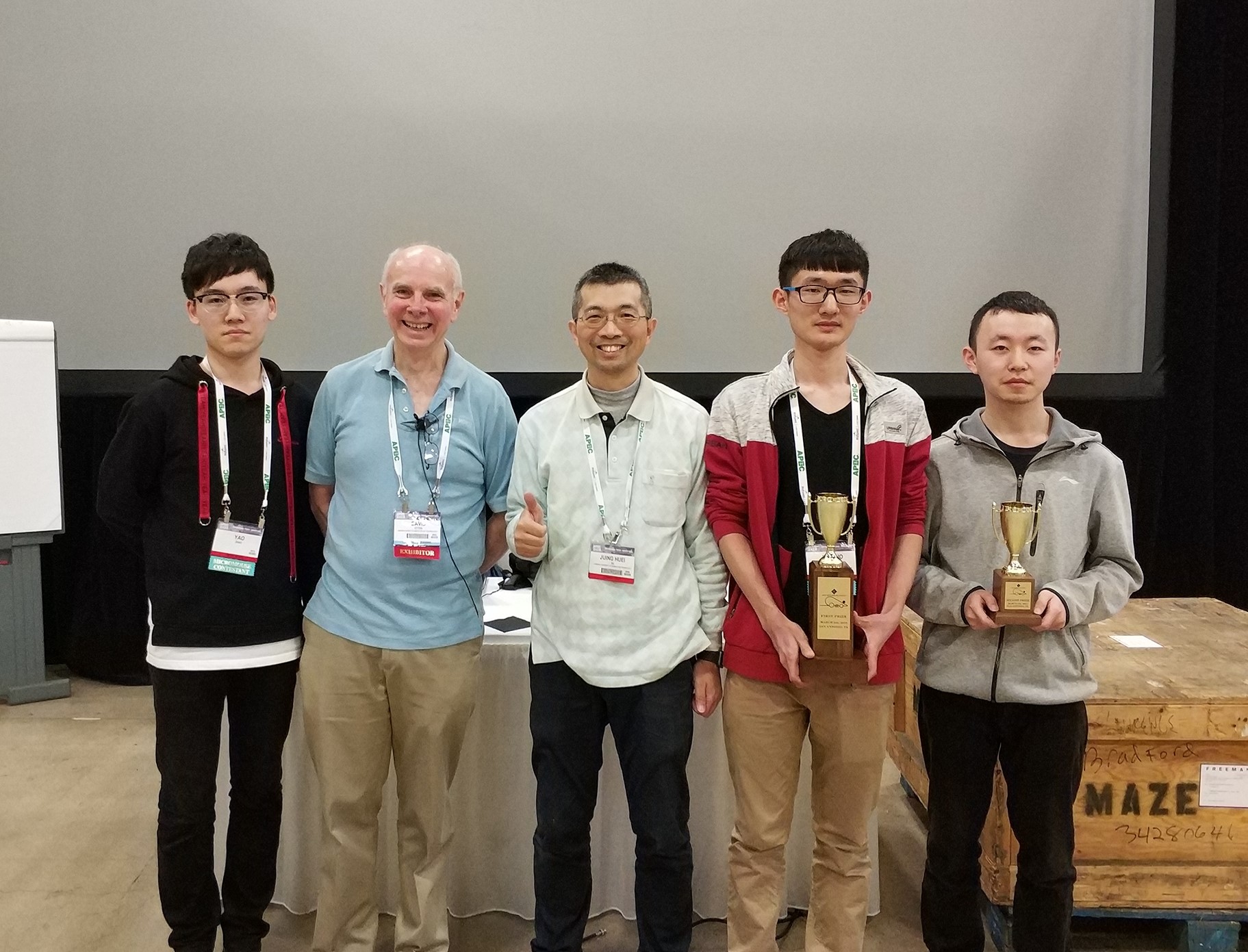 的参赛选手勇夺冠军。同时,也获得了2018年APEC电脑鼠大赛组委会的热情邀请。参赛师生深知,为了在这项最具国际影响力的大赛中取得佳绩,就不能满足于现有成绩,必须向国际一流水准看齐,勇于接受严峻的挑战。为此,参赛师生主动放弃了节假日的休息时间,加紧备战。经过一个寒假的奋战,使电脑鼠软硬件水平得到进一步提升,具备了与国际上最高水平选手较量的实力。