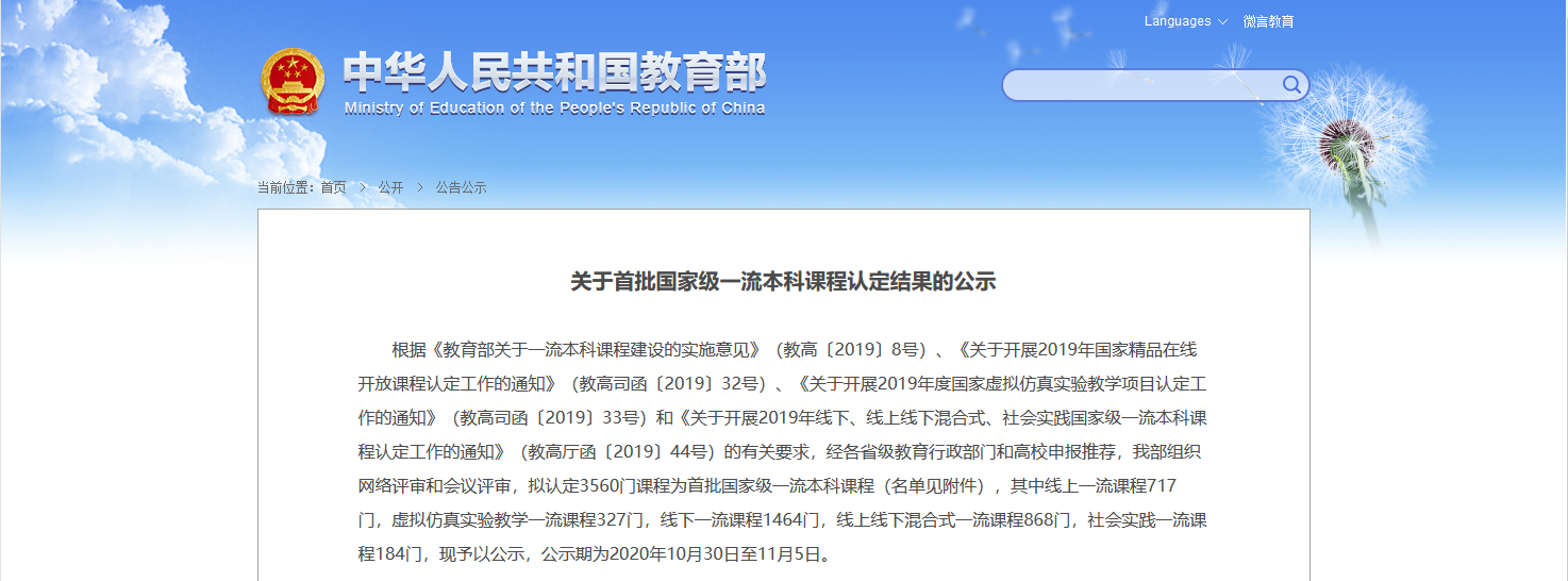 近日,教育部公示了首批国家级经各省级教育行政部门和高校申报推荐,教育部组织网络评审和会议评审,拟认定3560门课程为首批国家级一流本科课程。