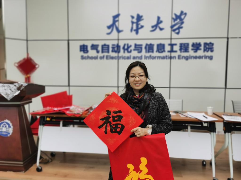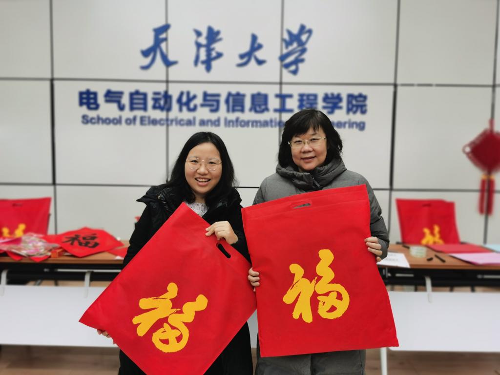 猜灯谜,知识答题,一张张生动的福字,一对对火红的春联,为教职工们送去了新年祝福。活动现场,老师们挥毫泼墨,笔走龙蛇,写下一幅幅春联。春联中有表达新年祝福的“春来大地金牛跃,福至人间紫燕飞”,也有体现天大特色的“海棠含韵辞旧岁,北洋傲雪迎新春”,一派祥和喜庆。