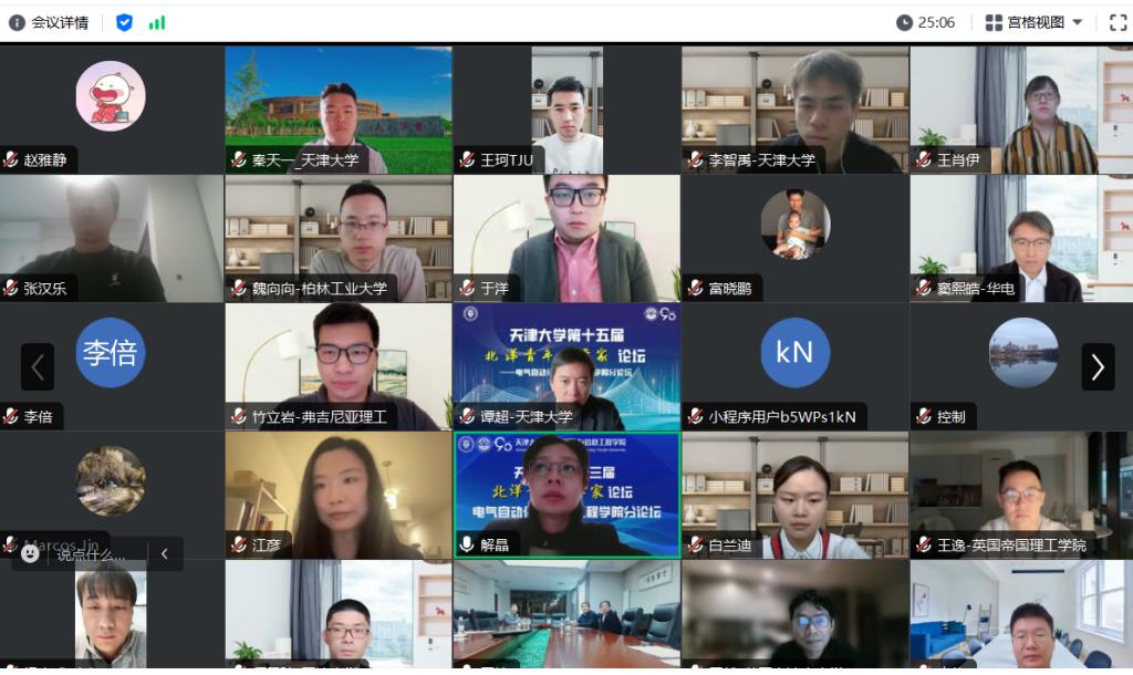分论坛按学科分设三个分会场,分别由贾宏杰教授、董峰教授、于晋龙教授主持。参会的青年学者分别围绕分布式智能电网、氢储能支撑新能源电网运行、弹性综合能源系统调度、超特高压、空间机器人、油水两相流微波测量方法等方面进行了精彩的学术报告,分享了各自的研究成果和经验。报告内容涉及电力系统、电力电子、特高压、智能检测、机器人、无人机等前沿研究。此外,更有具备丰富企业项目经验的学者,以消费级扩展现实与机器人视觉创新为题,向参会学者展示了不同维度下的科学研究成果。结合热点问题,与会专家与青年学者们进行了深入的交流与探讨,呈现了一场精彩绝伦的学术盛宴。