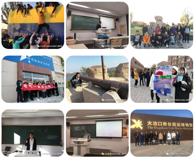 从17级电气一班团支部刚刚破壳而出,到现在日趋成熟,电气一班团支部开展了丰富多彩的活动,游大沽炮台,感悟炮台精神活动、“我与祖国共奋进”网络团日活动、学长党员面对面学十九大精神、习近平系列书籍读书分享会、关注孤独症患儿公益活动爱心传递、你我同行——扶贫义卖、 找寻初心——人生价值拍卖会、坚守初心——勇攀荣辱墙、践行初心——与南开青衿组联谊召开模拟人大。